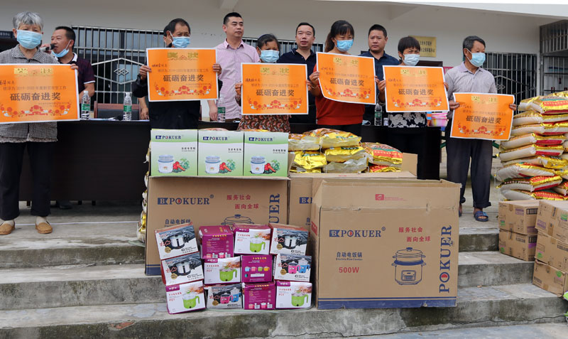 在村党群服务中心外面,几张会议桌连在一起,搭建成为颁奖主席台,一沓奖状早已准备完毕,自动电饭锅、快速电饭锅、泰香软米、洗衣粉、香皂粉、盆子、水桶等奖品堆放在主席台旁。