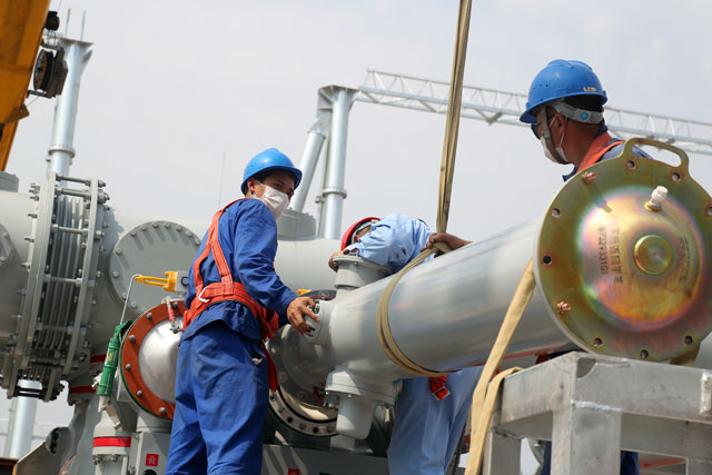 “五一”假期,顶骄似火,文化220千伏输变电工程紧锣密鼓。为“挽回”因疫情耽误的工期,工程加大了人力投入。18名党员坚守岗位,冲锋在前,100余名施工及管理人员放弃休假,抢抓黄金时节。变电工程为确保5月20日开始电气调试,动用两台吊车、两组人员完成了220千伏GIS组合电器的组装工作;线路工程为确保5月10日进入导线展放阶段,搭建两个组塔班组,一举完成5基铁塔组立。