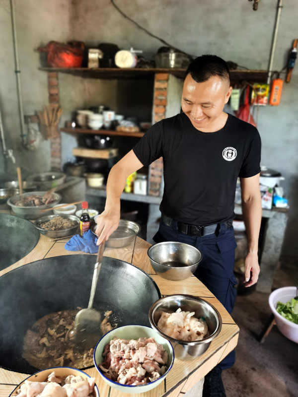 随后,大家情绪高昂开始做饭做菜,有的负责切菜,有的负责烧火,有的负责炒菜,分工协作,不一会儿,一大桌子菜就摆满了饭桌。饭桌上,谢胜元一家满脸笑容,大家面对面、近距离地交流交谈,谢胜元讲述了自己当兵、入党的故事。