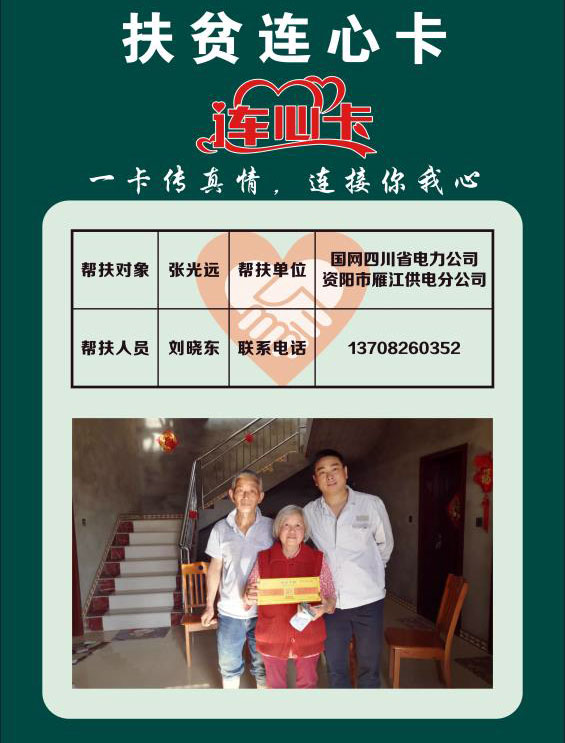 据悉,国网资阳市雁江供电公司定点帮扶区域涵盖伍隍爆花、老君宝积、常乐等贫困村和非贫困村,共273户贫困户的帮扶任务。为决战决胜脱贫攻坚,公司印制了273张扶贫连心卡,并张贴在每一户贫困户的家门口。帮扶责任人与帮扶对象的合影、帮扶责任人的联系电话等信息通过连心卡进行公示。公司通过心连心的举措,加强了帮扶人与帮扶对象之间的联系,更好地了解了贫困户的需求,为打通脱贫攻坚最后一公里贡献了一份力量。