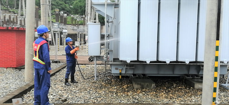 在清洗设备前,工作人员将清洗机可靠接地,穿戴好绝缘靴和绝缘手套,检查冲洗装备,在工作负责人的监护下按照《变压器散热器水冲洗标准作业卡》规范操作,历时6个小时圆满完成变压器冲洗工作。