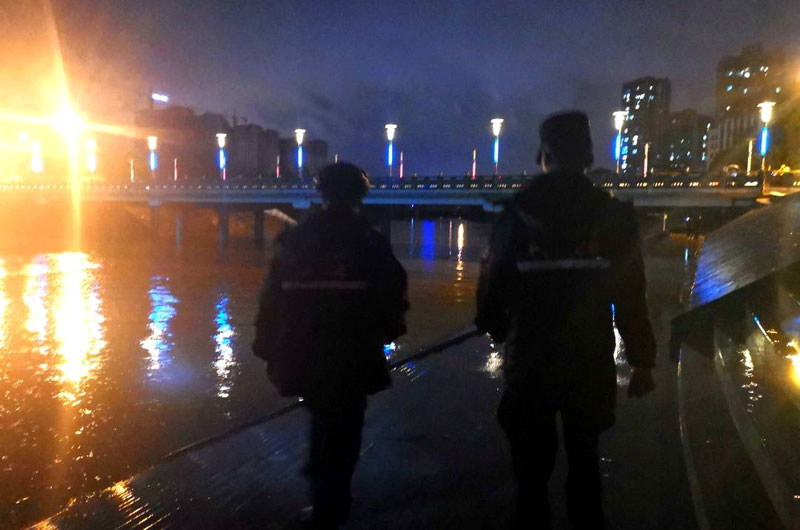| 8月16日晚,雁江分局民警苌弘广场持电筒在沱江边巡逻,对沿岸围观群众进行及时劝返,对隐患点进行排查,该工作一直持续至17日8时 |