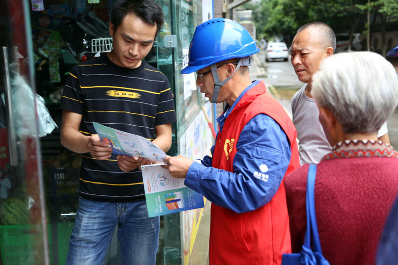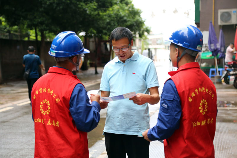 电力“红细胞”志愿者在小区内告知居民们雨天用电安全注意事项,“大家请注意,雨天请勿在电线附近的树下避雨,不要靠近变压器、电杆,当积水侵入室内时,应及时断开电源总开关......”