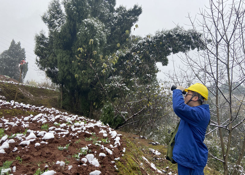 1月8日上午8点前,国网资阳市雁江供电公司输电运检班班长李正凯就和同事曾晓迪一起,踏着雪跋涉在田野里,今天他们要巡视的是35千伏南接线1号到25号杆塔约5.2公里的线路,这条线路是周边三个村镇重点保障线路。
