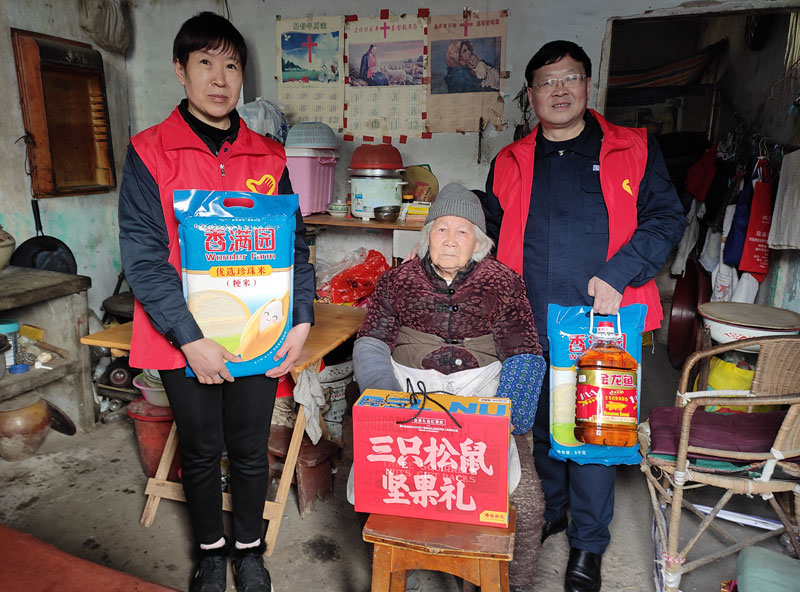 在一处偏僻的老旧小区里,志愿者找到了老人的出租屋,在简陋的屋子里,朱婆婆步履蹒跚地做着家务。看到志愿者送来的米、油、坚果等年货,朱婆婆喜出望外,深受感动,她颤抖着双手,握住志愿者的手说道:“感谢党,感谢政府,感谢电力公司的志愿者,祝愿好心人平平安安。”