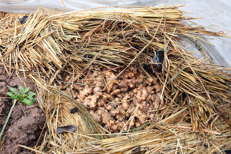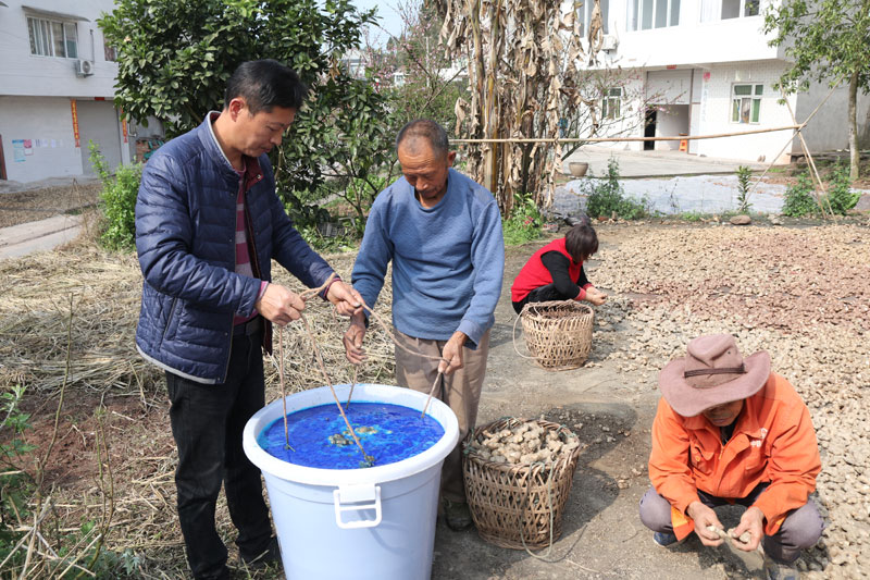 陈伟林在地里热火朝天的进行打窝,家里面的其他人也没有闲着。在陈伟林家的院坝里,已经拆分成几段的种姜铺满了整个院坝,经过两天的晾晒,种姜拆分后的创口已经“收汗”(变干燥),陈伟林的父亲正和家人一起,调配好杀菌液,准备将收汗完毕的种姜进行侵泡杀菌。“种姜晾晒‘收汗’后,再在杀菌液中侵泡五分钟左右,这样拆分后的创口基本上不会坏死,侵泡后将种姜铺在干稻草上,然后再盖上一层干稻草,最后用塑料薄膜覆盖,使其内部保湿升温,加快种姜发芽。”石羊镇总农艺师聂志尧指导着进行杀菌的同时,详细介绍着种姜催芽的过程。