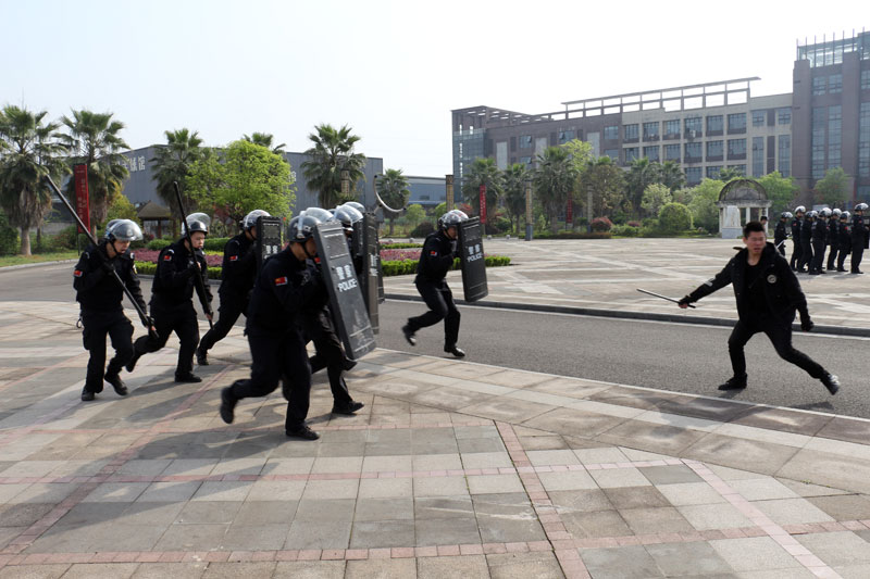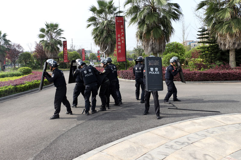 警情设置:在工业园区,三名嫌疑人喝酒喝多了,砍伤了五名群众。接到110指令后,特巡警大队2支快反组立即赶赴现场处置。到达处置现场以后,特巡警队员下车以后展开队形,嫌疑人看到有警察后,其中一个喝酒喝的比较多,主动攻击警察。处警民警在原有队形基础之上,将第一个嫌疑人现场处置。剩余两名嫌疑人见情况不对,分别朝两个方向逃跑,此时,现场民警将剩余的队员进行分组,一组追击一个嫌疑人,另外一组队员加上警犬,追击另一名嫌疑人,最后成功将两名嫌疑人成功制服。