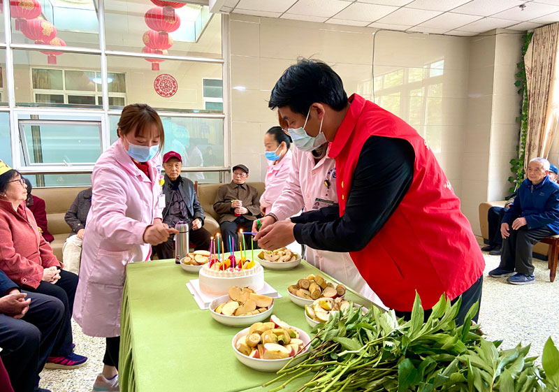 志愿者们买来新鲜的水果,围坐在老人们周围,和他们一起拉拉家常,切水果、切蛋糕、唱生日歌,过集体生日的老人们,有的经历过硝烟弥漫的战争年代,有的在热火朝天的建设时期挥洒过青春汗水,有的在改革开放的浪潮中披荆斩棘,一段段生动鲜活的故事,从他们口中娓娓道来,让志愿者们深受教育。