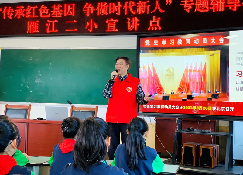 三是红色思想进头脑。以党史故事为青少年党史学习教育主要内容,发挥好学校关工小组作用,积极邀请“五老”志愿者讲党史故事,让红色思想代代相传。在三贤九义校开展的“童心向党·梦想起航”未成年人“学党史·感党恩·跟党走”系列活动中,“五老”志愿者唐晓梦为600余名孩子们上了一堂别开生面的党史课,通过生动的资阳本地党史故事带领孩子们感受中国共产党筚路蓝缕奠基立业的百年历史,感受家乡在中国共产党领导下翻天覆地的变化,从而引导他们传承好红色基因、红色精神。雁江一小、雁江八小等依托校园广播站,开设党史故事广播专栏,组织学生利用课间时间进行党史故事广播,用孩子们喜闻乐见的方式开展党史教育,让青少年喜欢学、记得住、有成效。