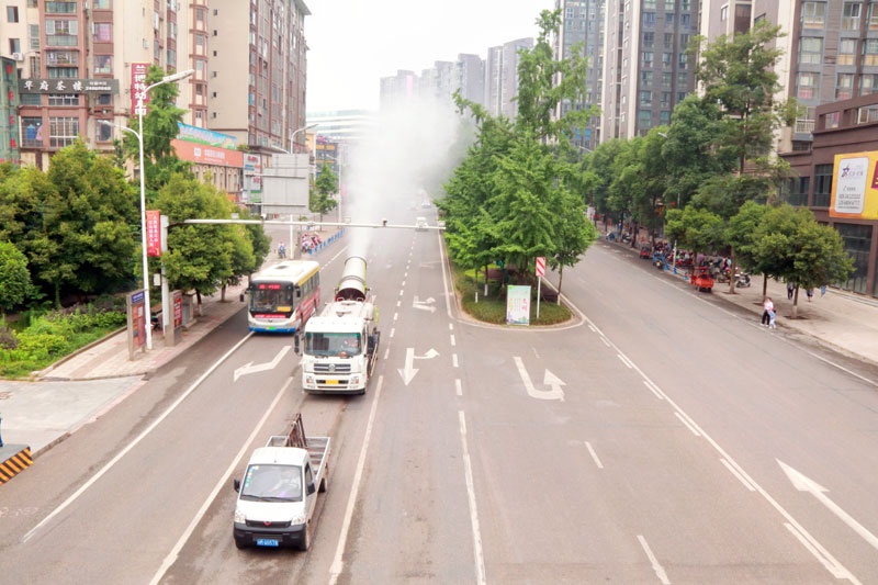 加强扬尘污染源头管控的同时,该局日常扬尘治理也没有松懈。“县城区一共有抑尘车一辆、洒水车十辆、扫地车四辆,每天早上六点就开始进行作业,一直到晚上八点,主要是对空气进行除霾降尘和对街道路面进行冲洗。”安岳县环境卫生管理所副所长刘远华介绍道,通过轮班作业的方式,每天晚上十点后还有四台洒水车通宵作业,对县城内车行道进行清洗,全力打造干净整洁的城市环境,提高群众生活幸福指数。