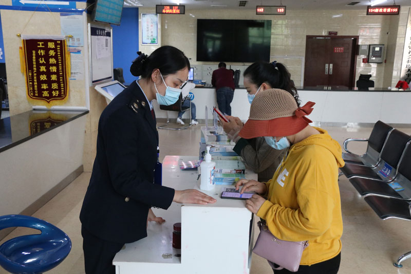 | 安岳县政务服务中心工作人员指导办事群众进行“掌上办理” |