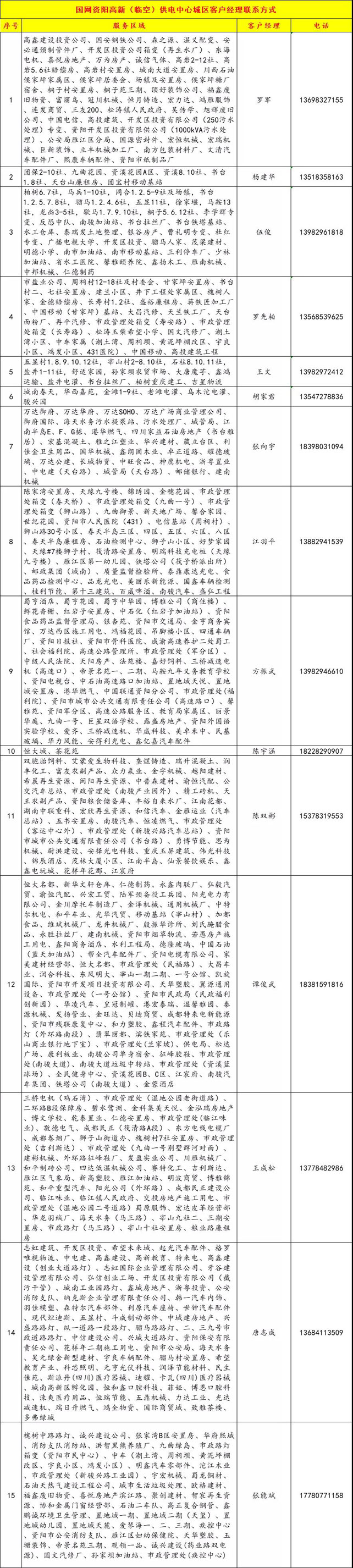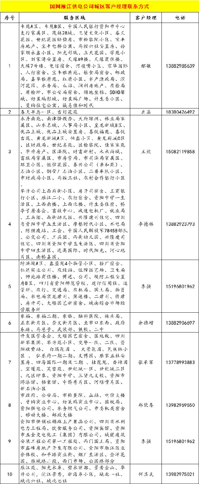 近日,资阳供电公司在微信公众号上公布了雁江区、安岳县、乐至县及高新区、临空经济区等辖区内的小区对应的客户经理的姓名和电话号码。