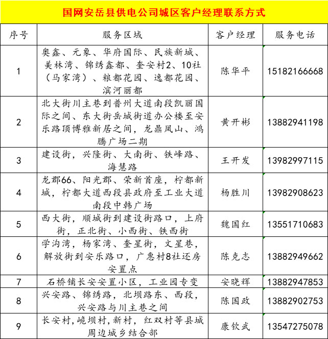 服务就在身边 资阳供电公司公布城区客户经理电话