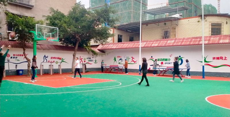 项目于2021年5月启动、9月底全面完成。健身中心充分利用原有资源,并进行升级改造:将街道办事处后操场原有的篮球活动场地一分为二,保留原篮球场功能的同时新增了羽毛球、室外乒乓球场地;在办事处3楼设置了室内乒乓球室、瑜伽舞蹈室和器材室,将4楼大会议室改建为集健身和乒乓球为一体的室内活动室。