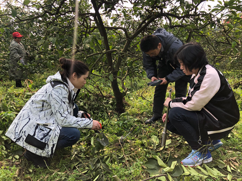 | 资阳市气象局农气专家在柠檬园测试土壤水分 |