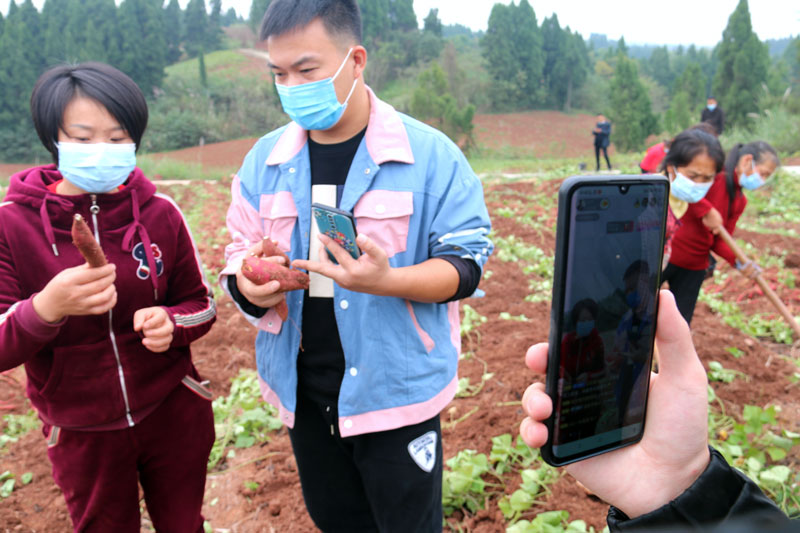 “欢迎直播间的宝宝,我是红薯妹妹,这是我们的有机红薯,它口感纯正,2016 年还进入了人民大会堂哟......”11月11日下午,安岳县周礼镇海棠村的百亩红薯地里一派忙碌景象,黄晓艳举着个头匀称的有机红薯绽开了笑脸。当天下午,在她的宣传下直播间卖出了1000余单有机红薯。