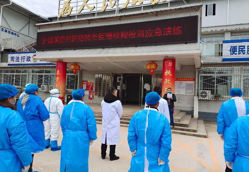 本次演练模拟以护建镇观音社区1居民核酸检测结果阳性为背景,护建镇新型冠状病毒肺炎疫情防控工作领导小组办公室立即召开党委会分析研判,制定可行性应急方案,下达辖区内全员核酸检测指令,并快速启动应急处置,模拟全员核酸检测场景。