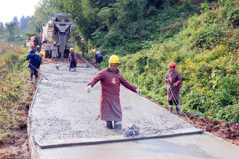 四川新闻网消息(朱国强 解小峰 记者 杨颜铭)青翠的松柏,纷飞的黄叶,浅白色的新建水泥路蜿蜒盘旋,在初冬暖阳的照耀下,仿若一条“白丝带”在林间飞舞。11月24日,在安岳县双龙街乡起凤村的道路建设现场,透明的塑料薄膜整齐地覆盖在平整完、还未彻底凝固的水泥路面上,前方十余名工人配合混凝土罐车,正分工有序的铺筑水泥混凝土。