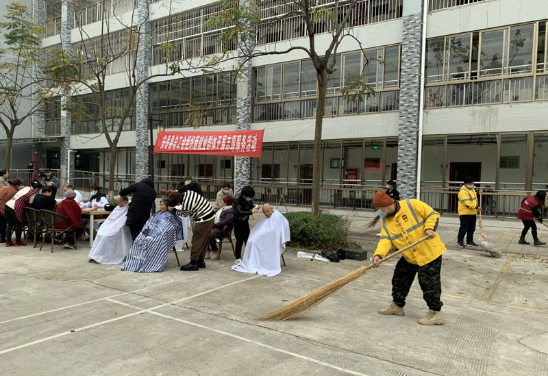 志愿服务活动现场,除了医生和理发师发挥特长服务老人以外,网约送餐员、商场信息员和快递员也分头行动,有的去搀扶老人,带他们去测血压、理发;有的拿起扫帚扫去院内掉落的树叶、清理花园中堆积的腐烂枝叶;有的去和房间里不愿出门的老人们进行谈心交流,关心老人的饮食起居、兴趣爱好等情况。