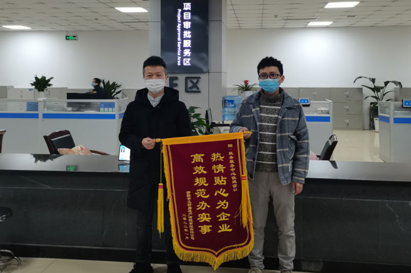 2022年1月13日上午,资阳市立轩房地产开发有限责任公司朗基香樾府建设项目的两名负责人将一面锦旗送到雁江区政务服务中心住建窗口首席代表陈鹏手中,感谢该区住房城乡建设局窗口工作人员倾心为民、高效快捷、踏实热忱的服务。
