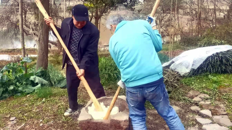 张宗吉介绍说,做糍粑首先得将糯米提前泡上一夜,第二天把水倒掉,将泡软的糯米放入大蒸桶蒸熟,再把糯米倒进石臼里,撒上适量白糖。打糍粑是项体力活,通常都是附近乡亲互相轮流帮忙,一人拿一根糍粑棍围着石臼边转圈边捶打,直到糯米全部捣碎变成黏在一起的糯米团子,这时要趁热将糯米团放到抹完油的桌子上,然后一捏一拧一搓,一个个圆溜溜、香喷喷的糍粑就做成了。