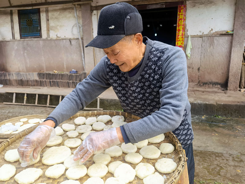 在华严镇龙园村,村民唐纯昭老人和儿子、儿媳们正吃着香甜软糯的红糖糍粑,满院子弥漫着糍粑的清香。她看着眼前的糍粑,想起了在成都务工的孙儿潘虎,他在家时最喜欢吃糍粑。她立即给孙儿打去了电话,告诉他家中已做好很多的糍粑,等他过年回来吃。