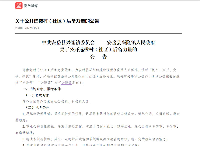 | 安岳县兴隆镇在安岳融媒“安岳号”上发布招考公告 |