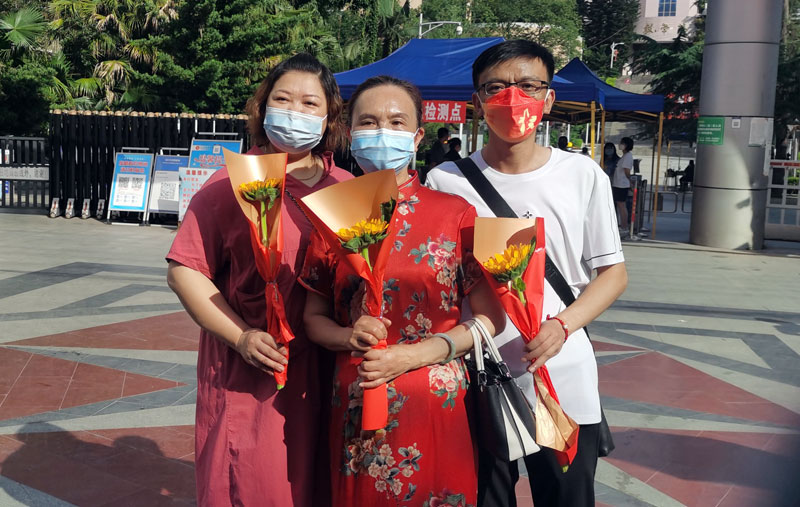 “祝孩子们乘风破浪,金榜题名!”“孩子们加油!”……在安岳中学考点,有的送考家长身穿旗袍、有的送考家长手持向日葵,一同为考生们加油鼓励,希望他们“旗开得胜”“一举夺魁”。