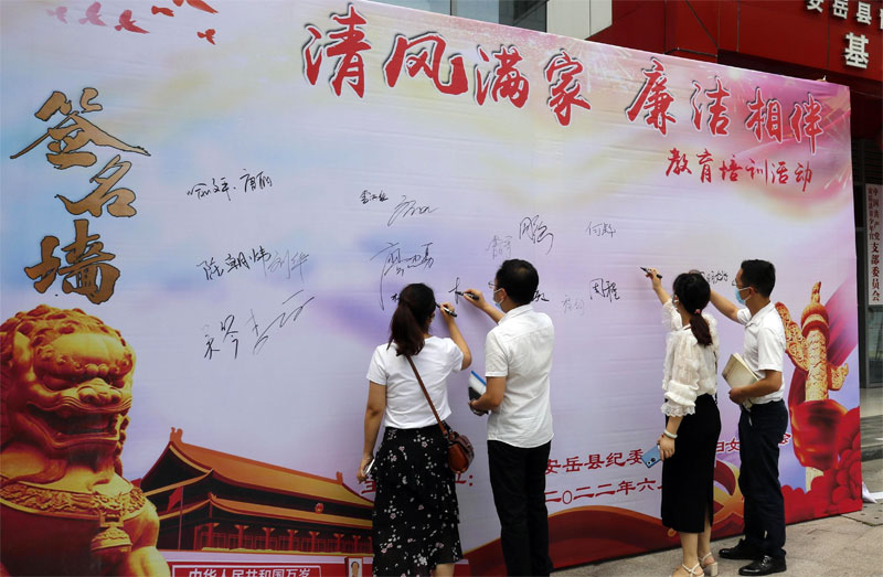 | 参加安岳县2022年第一期“清风满家-廉洁相伴”教育培训的党员干部夫妻在签名墙上签名(李旭 摄) |