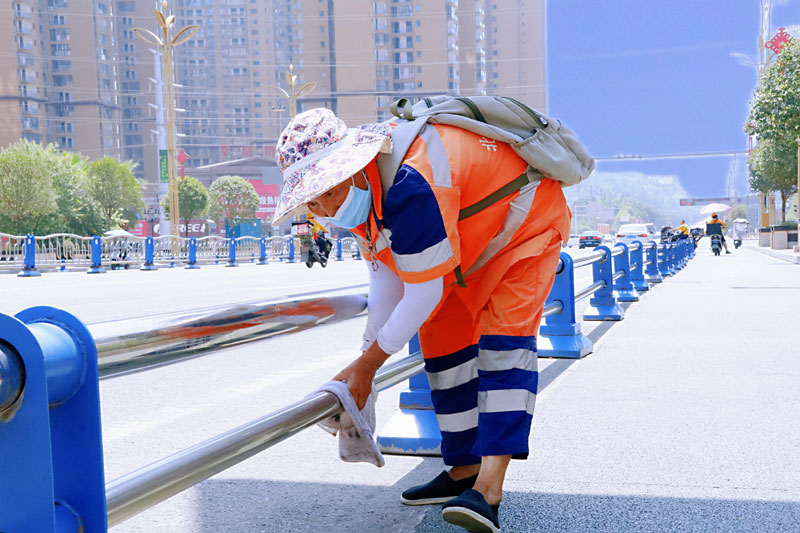 扫路面、擦护栏、清垃圾……在中迪商业广场外面,记者一行看到几名环卫工人无惧炎炎烈日,踏着滚滚热浪,在岗位上不停地忙碌着。向露珍是几名环卫工人中的一员,记者看见,她用毛巾把脸裹了个严实,刚擦拭完台上的灰尘,看到一段护栏上有灰尘,立马又拿着抹布擦洗起来。