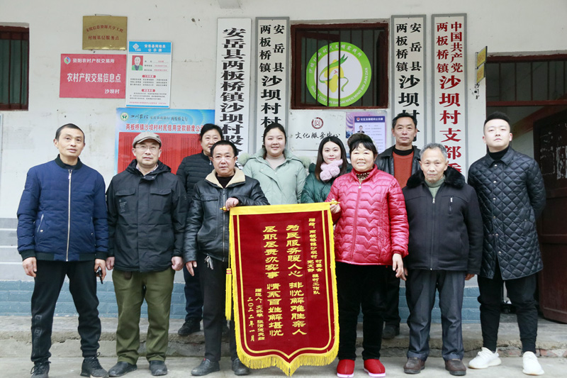 | 安岳县两板桥镇沙坝村村民文怀琴向村“两委”和驻村工作队赠送锦旗表示感谢 |