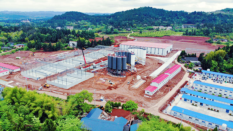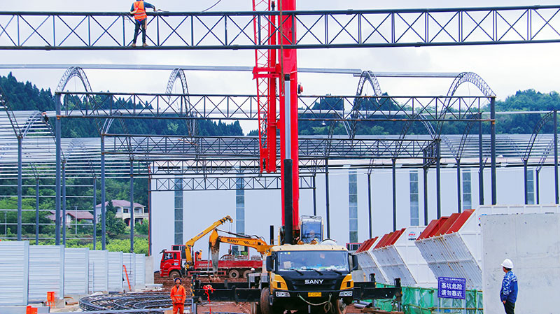 “目前,我们的一号拌和站配置了3台HZS180型混泥土搅拌机,主机和粉料罐都已安装完成,本月底将能完成所有的临建施工,计划供应混泥土44万方;一号钢筋加工场,长78米、宽46米,配置了4台桁吊,现正在进行钢筋加工设备调试、管线铺设,临建已基本完成,计划生产钢筋4万吨。”在施工现场,中铁十九局成渝中线8标一分部总工程师徐洪鹏介绍。