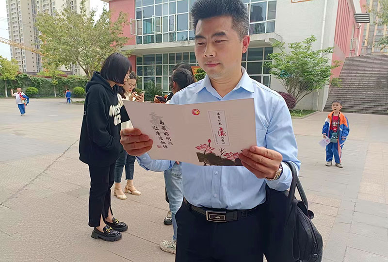 | 家长正在看孩子赠送的廉洁卡和书签(严知好 摄) |