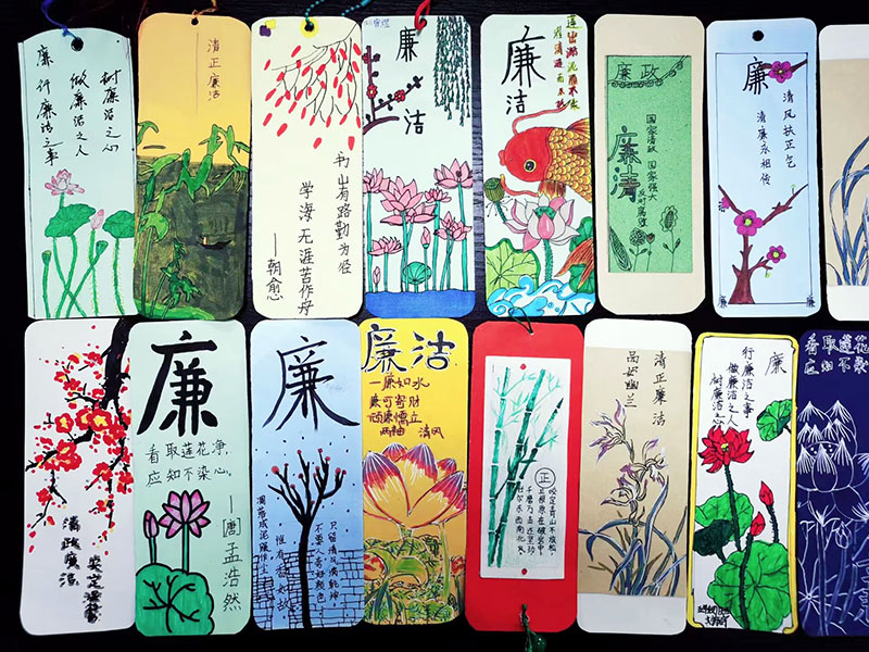 | 学生手绘的廉洁书签作品(严知好 摄) |