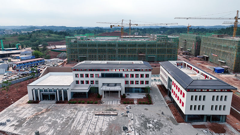 项目现场负责人陈元介绍,目前工地有700余人在施工作业,主要进行绑扎钢筋、砌砖、抹灰、外架拆除、外墙施工等。综合楼和电商楼已经完成外装工作,正在进行内装。6月底,一期主体工程全部封顶,整个项目预计在11月底竣工投用。
