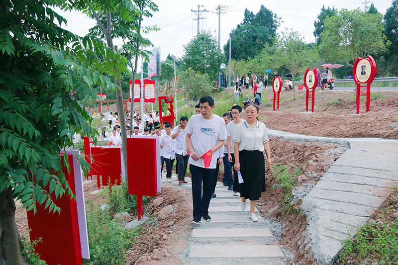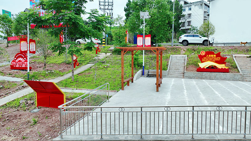 当天,在朝阳场镇,只见园内广场热闹非凡,镇上组织党员干部们正在这里重温入党誓词。步入主题园里面,只见地面铺设着整洁的青石板,红色主题元素非常醒目。