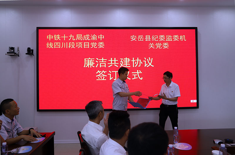 为有力护航成渝中线高铁项目建设,促进“纪企共建”,将清廉元素融入重大项目,安岳县纪委监委以开展“迎‘七一’清风铸忠诚”活动为契机,与中铁十九局成渝中线高铁项目党委联合开展主题党日活动,通过现场签订《廉洁共建协议书》、举办廉洁知识竞赛、观看警示教育片、开展座谈交流、重温入党誓词、举办趣味活动等方式,为企业注入“清廉因子”。