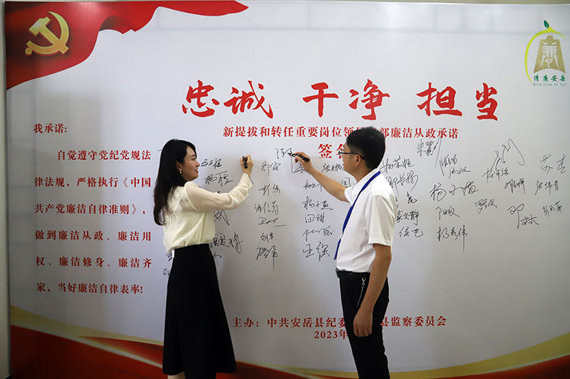 集体谈话后,近期新提拔科级干部们一起观看了《“青廉说”年轻干部说清廉》主题演讲决赛展播视频,聆听其他党员干部清廉故事;现场观看了党风廉政警示教育与廉洁好家风巡展,通过感悟正向的优良家风、吸取反面违纪违法案例教训,注入清廉“强心剂”;在廉政承诺签名活动中,大家在签名墙上郑重签名,表示将以实际行动践行廉洁从政、廉洁用权、廉洁修身、廉洁齐家的庄严承诺,争做廉洁自律的表率。