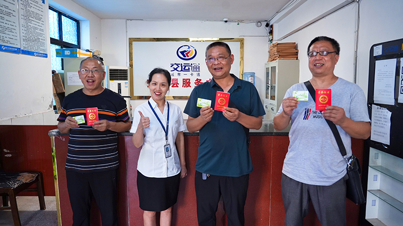 | 耿宏伟等老教师和公交教师卡办理柜员合影 |