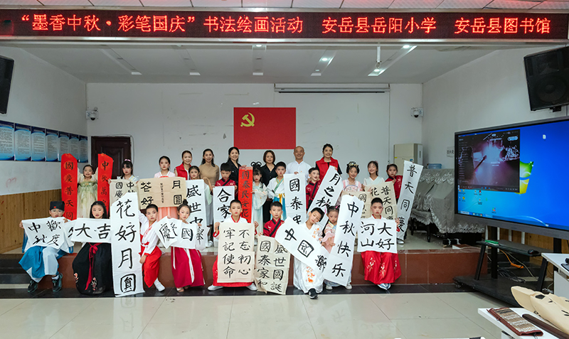 四川新闻网消息 为推动图书馆公共文化资源和优质服务进校园,实现图书馆与学校资源共享,9月20日,安岳县图书馆与安岳县岳阳小学共同举办“墨香中秋·彩笔国庆”书法绘画活动,150余名师生参加了活动。