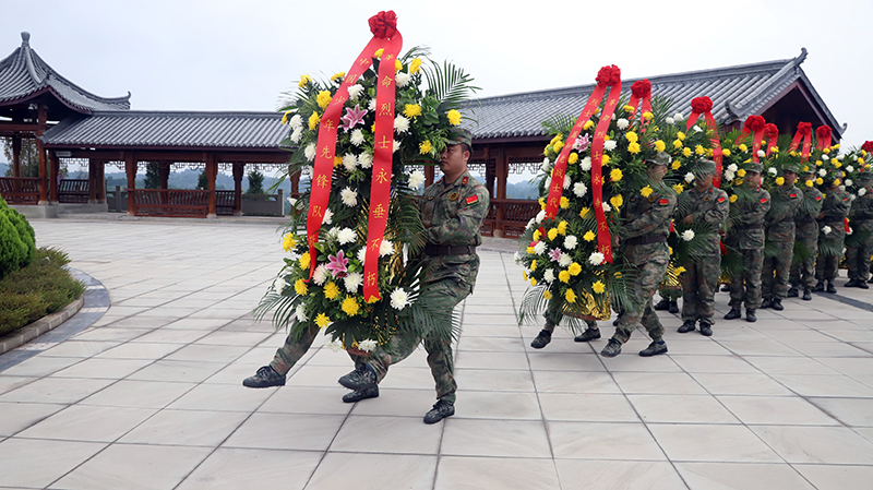 承载敬意与哀思的花篮整齐地摆放在纪念碑前,伴随着《献花曲》悠远深情的旋律,参加仪式全体人员依次缓步绕行,深情瞻仰烈士纪念碑、烈士墓,敬献鲜花,寄托对英烈的深切缅怀和崇高敬意。