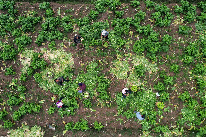临近冬日,天气已逐渐转寒冷,但元坝镇农业生产却一派火热。11月13日,笔者走进元坝镇天王村四季蔬歌家庭农场看到,七八个工人有说有笑,正在田里采摘包菜。在不远处,一辆运输车停靠在地头,收购人员正在装卸工人背过来的包菜。