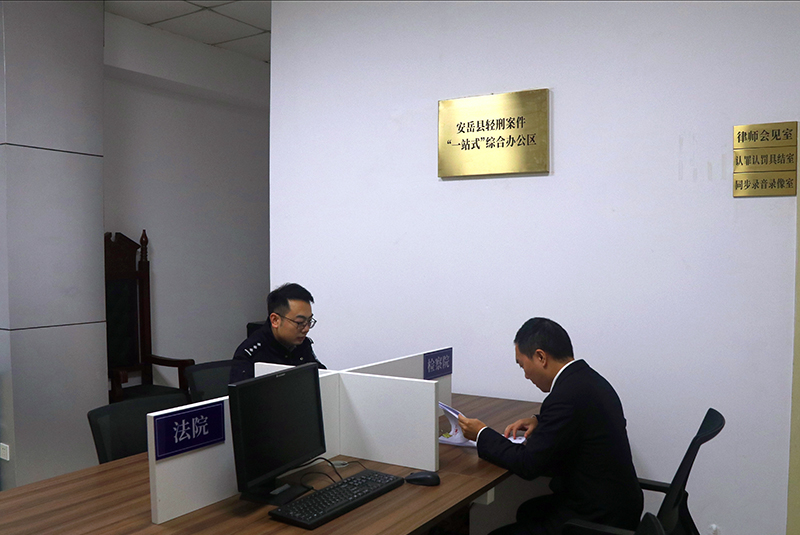11月15日,笔者走进安岳县公安局非羁押轻刑案件侦诉审“一站式”办案中心,看到中心内设有速裁法庭、办案中心、检察官和法官办公室等专用功能区域,并派驻检察速裁办案组和值班律师进行值守。