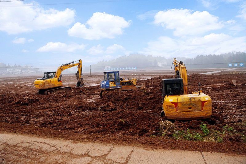 近日,笔者来到安岳县高升乡天佛村1050亩高标准农田建设工程施工现场,只见施工人员正忙碌作业,挖掘机、推土机等机械全速运转,现场一片火热的建设景象。