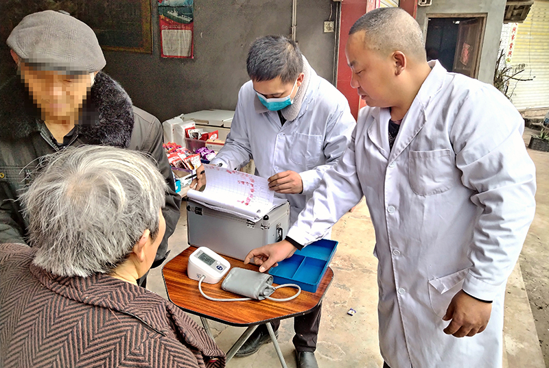 在安岳县横庙乡五柏社区,乡卫生院的医务人员,正挨家挨户为老年人免费检查身体。