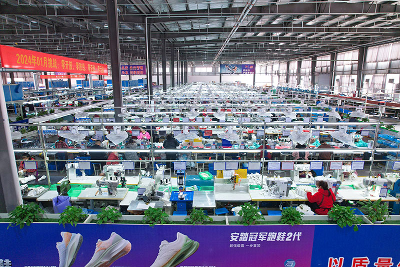 安岳安鑫是安踏集团的重要合作伙伴。自去年10月由过渡厂房迁至新厂后,企业产能得到极大释放,去年实现产能300万双(套)。今年2月17日,企业全面复工复产,共有26条针车线、6个裁备组、8条成型线,每天产量约16000双。