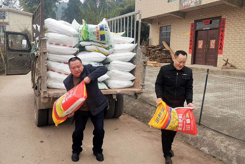 | 吴先东(左一)和同事忙着将农资送到农户家 |