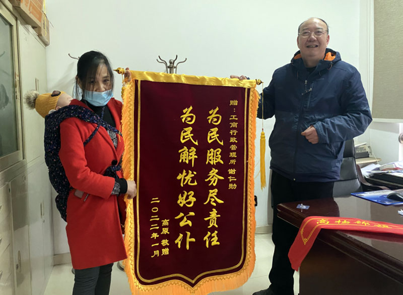 四川新闻网消息(邹正刚 记者 杨颜铭)“非常感谢市场监管部门维护我的合法权益,让我拿回了订金,让我终于放下心来。在调解过程中,我感受到了你们的耐心、热心和细心,为我们老百姓排忧解难”。1月24日,消费者高女士来到资阳市雁江区市场监管局宝莲监管所,向工作人员当面赠送一面书写有“为民服务尽责任,为民解忧好公仆”的锦旗,激动地向帮她办理调解的工作人员道谢。