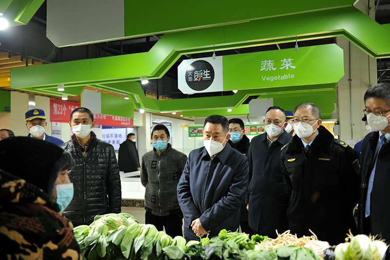 王善平先后来到德麦盛超市、大地综合农贸市场,与相关负责人深入交流,详细了解蔬菜、猪肉、米、油等食品储备、市场供应、价格浮动等情况。