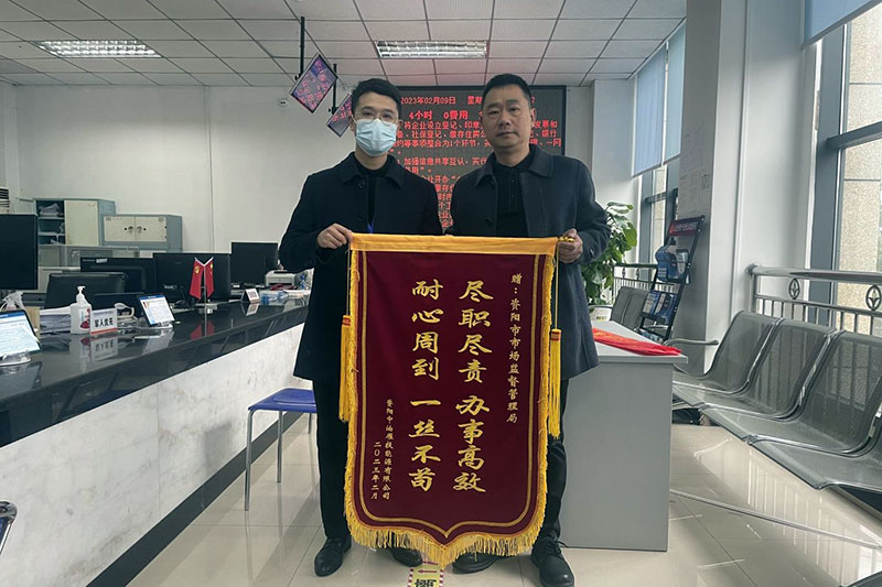四川新闻网消息 近日,资阳中油雁投能源有限公司负责人将一面印有“耐心周到一丝不苟 尽职尽责办事高效”的锦旗送到资阳市政务中心市场监管局窗口,对窗口及工作人员给予雁江区中和镇工业园区加油站项目耐心服务表示衷心感谢。